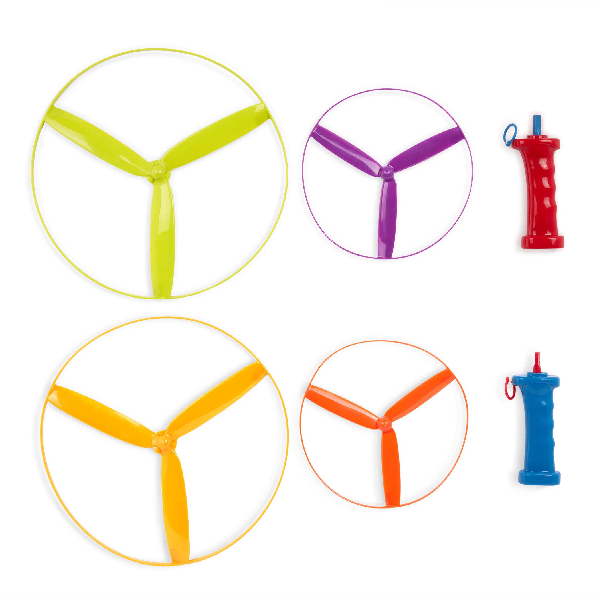 Achtung kleine Piloten – dein Propellespielzeug hebt gleich ab! Bereit, fertig, los! Dieses Propellespielzeug-Set macht so viel Spaß – zieh einfach an der Schnur des Launchers und sieh zu, wie die Scheibe hoch in den Himmel fliegt. Mit 2 Launchern und 4 Scheiben ist dieses Spielset eine tolle Aktivität für Eltern und Kinder. Versuche doch, in den Garten zu gehen und eine Langstreckenflugwettbewerb zu veranstalten! Dieses bunte Spielzeug bietet eine großartige praktische Demonstration des Konzepts von Ursache und Wirkung. Und ganz nebenbei, während dein Kind herumläuft und versucht, die Scheibe zu fangen, bleibt es auch aktiv! Alle Battat-Spielzeuge erfüllen oder übertreffen die Sicherheitsstandards der EU, USA und Kanada. Empfohlen für Kinder ab 3 Jahren.